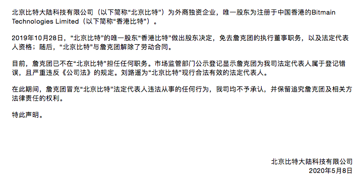 根據比特大陸官方 5 月 8 日中午的回應,北京比特大陸的法定代表人由其唯一股東香港公司及其唯一董事吳忌寒決定。目前由北京比特的總經理劉路遙先生合法擔任。並表示,「在此期間,詹克團冒充『北京比特』法定代表人違法從事的任何行為,我司均不予承認,並保留追究詹克團及相關方法律責任的權利。」
