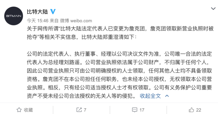 面對換了法人的營業執照,比特大陸於昨日下午三點發布官方聲明,表示不予承認詹克團冒充「北京比特」法定代表人行為,保留追究詹克團及相關方法律責任的權利。