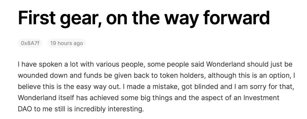 28 日,Daniele 發佈一篇文章表示,有不少人建議他將 Wonderland 關閉,將資金還給持有者;但他認為Wonderland 本身已經取得了一些重大成就,而投資 DAO 對他來說非常有趣。