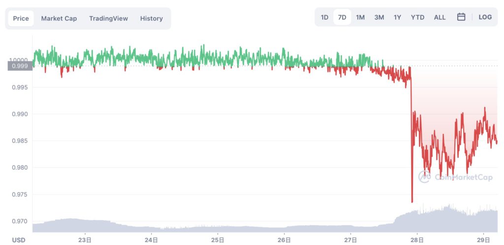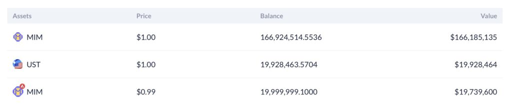 目前投資人不斷將穩定幣 MIM 轉變為其他穩定幣,Curve 上與 MIM 有關的穩定幣池幾乎全數被抽光 (MIM – 3Crv、MIM – UST…),從 Curve 上的 MIN/3CRV 池數據來看,MIN/3CRV 資產比例一度嚴重傾斜至 95%/5%,使 MIM 出現明顯脫鉤情況,目前 MIN/3CRV 資產比例略微回升至 93.95% / 6.05%,危機仍然存在。