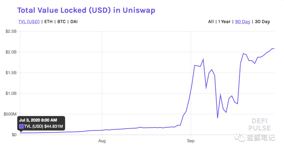 在今年年初的時候 Uniswap 上鎖定的資產量才 1,500 萬美元左右,即便是兩個月前的 7 月 25 日也才 8,000 多萬美元,而僅僅兩個多月後,Uniswap 鎖定資產量超過 20 億美元,可見其發展的迅速。