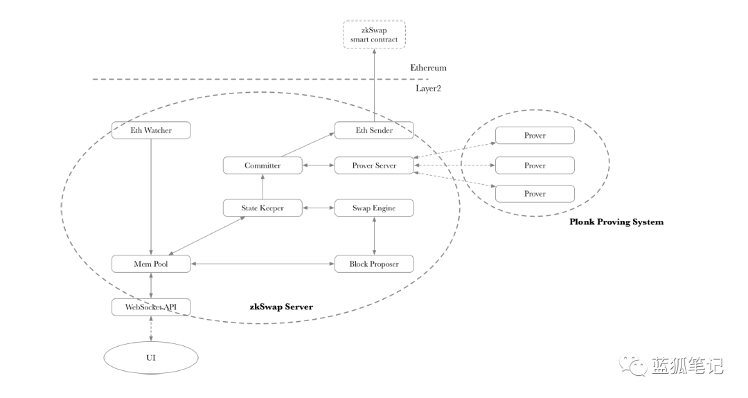 從大框架來說,ZeroSwap 系統包括了鏈上智能合約、鏈下 ZeroSwap 服務端、零知識證明系統以及前端用戶界面。