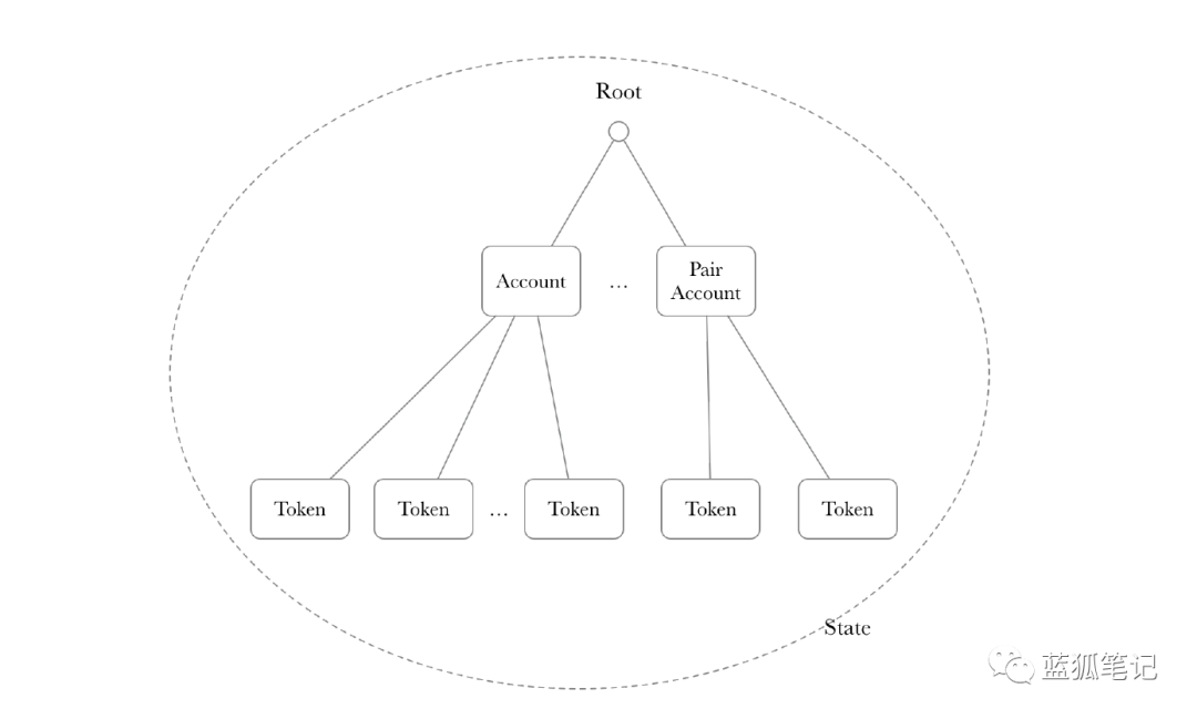 ZeroSwap 的交易過程會反映到其狀態樹的變化上。ZeroSwap 的狀態樹是高度為 34 的默克爾樹,用於記錄當前系統中所有帳戶的餘額狀態。根節點 Root 的子節點為系統中所有帳戶節點,帳戶節點包括普通帳戶節點和 Pair 帳戶節點。